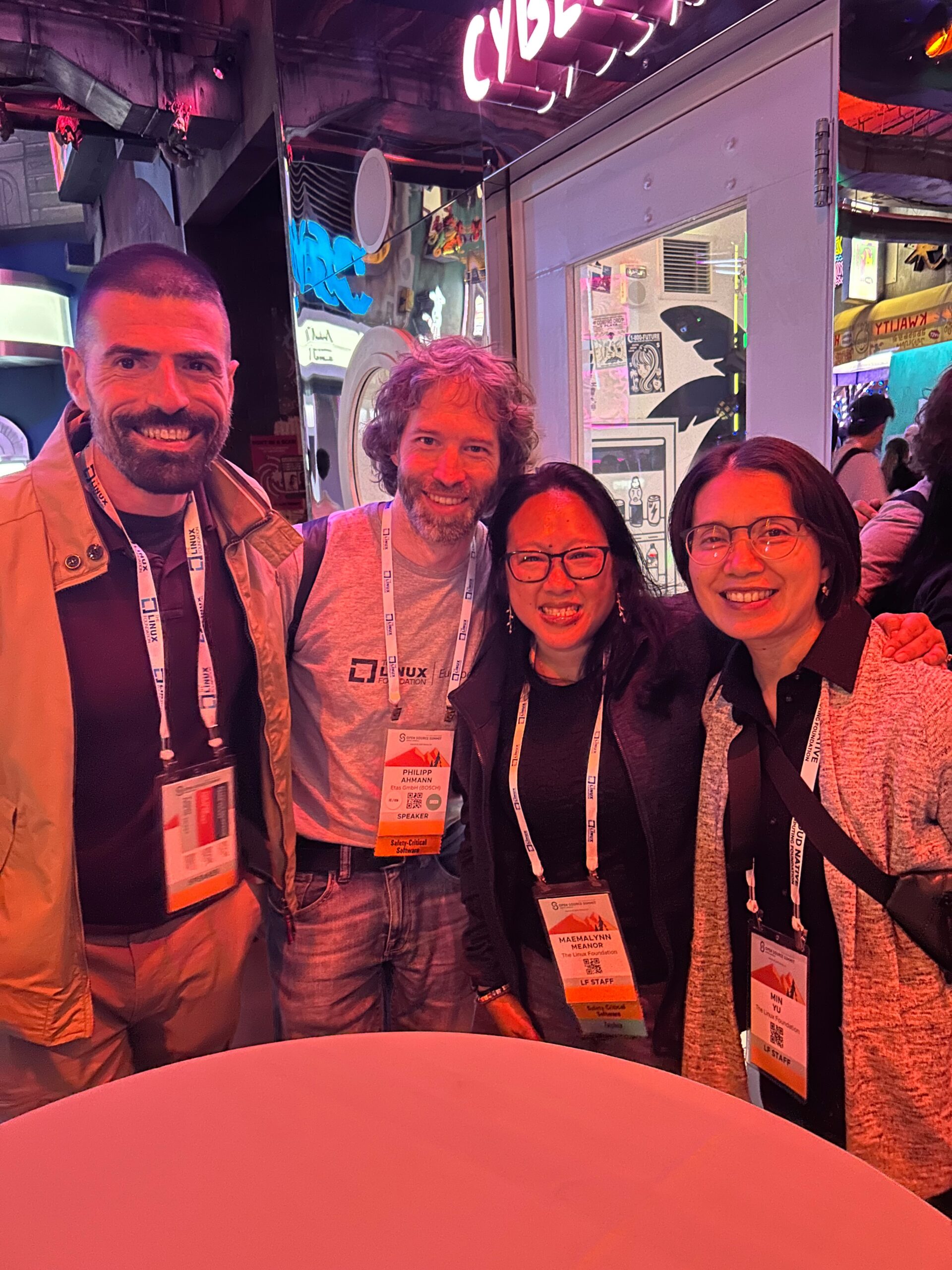 - Gabriele Paoloni, Red Hat; Philipp Ahmann, Etas GmbH (BOSCH); The Linux Foundation’s Maemalynn Meanor and Min Yu at the attendee reception at Meow Wolf Denver